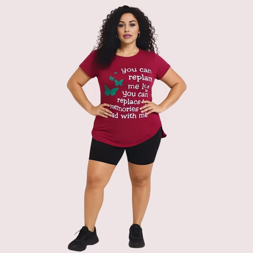 Elevate your casual wardrobe with our Butterfly Print Inspirational Graphic Tee – Pack of 2. Designed for comfort and confidence, these soft, breathable tees feature a flattering fit and uplifting text graphic paired with charming butterfly prints. Made from high-quality cotton blend fabric, these t-shirts are perfect for everyday wear — whether you’re running errands, relaxing at home, or enjoying a casual outing. The curved hem and short sleeves add a stylish touch, while the inspirational message reminds you that memories are irreplaceable. Comes in a convenient pack of two, making it easy to mix, match, and feel good every day.