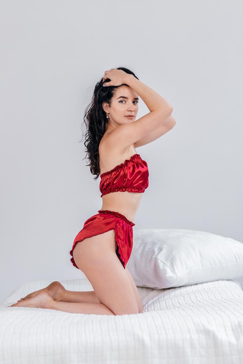 The bralette is of very simple construction – the gathered bandeau with soft elastic at top and bottom. The elastic is covered – and no and contact with your body. Nice ruffles at top and bottom – will make your look very feminin.