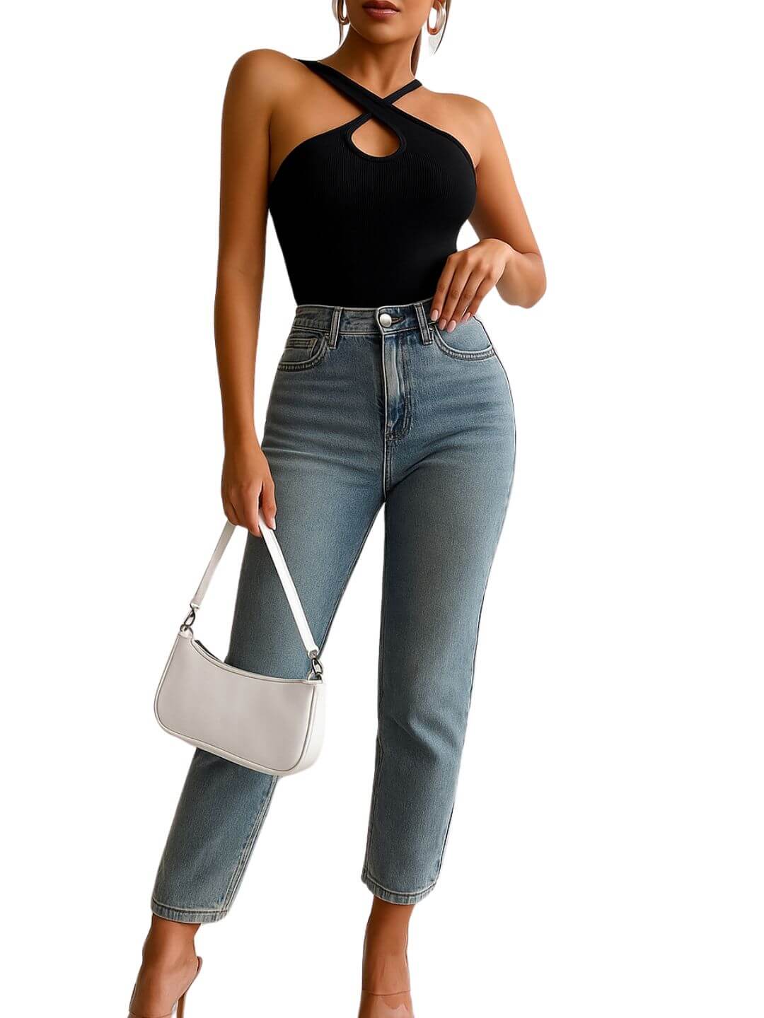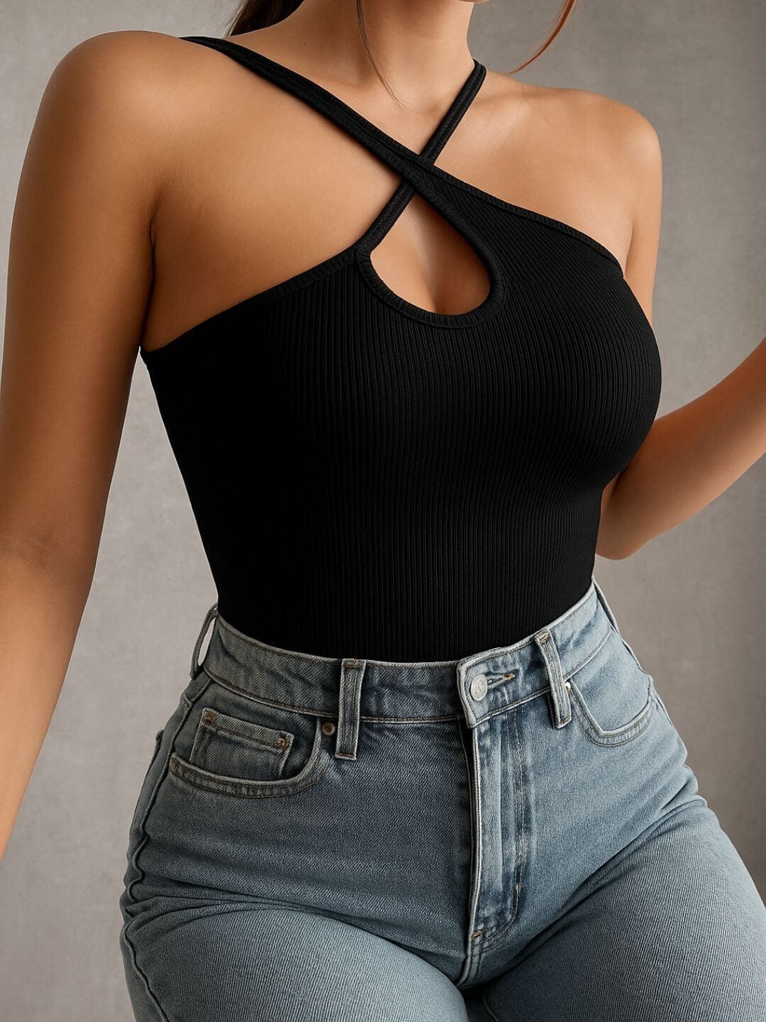 Elevate your style with this chic and versatile black halter top. Designed with a flattering cross-front neckline and a keyhole cut-out, this sleeveless top brings a modern edge to any outfit. Crafted from soft, ribbed knit fabric, it offers a body-hugging fit that enhances your natural silhouette while ensuring comfort and stretch. Perfect for both casual outings and night events, it pairs seamlessly with high-waisted jeans, skirts, or trousers.